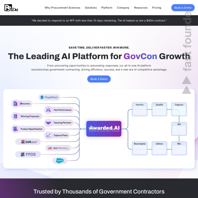 “AI for Government Contracting. Procurement Sciences uses AI to help you find, manage, and bid on federal, state, local, and education government opportunities. Use AI for proposals to automate bottlenecks and win more government contracts.”