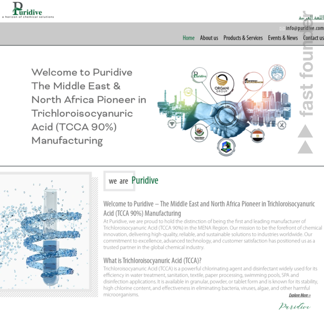 “Puridive - The first and leading manufacturer of Trichloroisocyanuric Acid (TCCA 90%) in the MENA region. We provide innovative, sustainable chemical solutions for water treatment, sanitation, and industrial applications.”