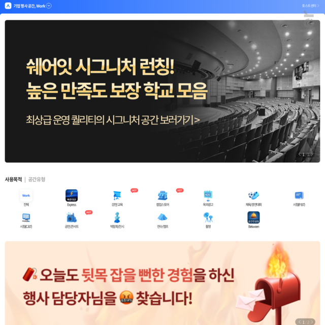 “일할 때도 놀 때도 공간은 쉐어잇! 기업, 대행사가 많이 찾는 팝업스토어, 강연, 워크숍, 콘서트, 촬영장소 등의 비즈니스 공간과 체육관, 파티룸, 강의실 등 개인의 모임 공간을 쉽고 빠르게 대관해 보세요!”