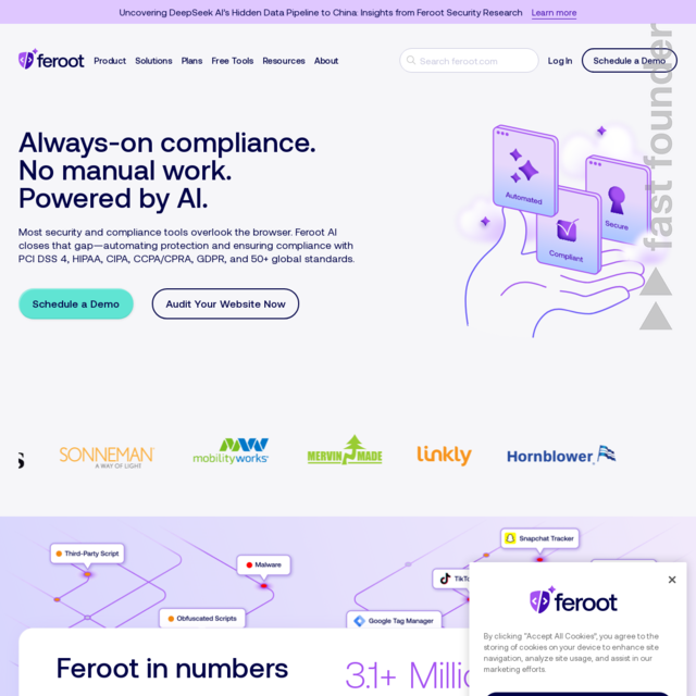 “Feroot Autonomous Privacy Compliance and Security Management keeps websites secure and compliant with PCI DSS, CCPA, HIPAA, 50+ laws.”