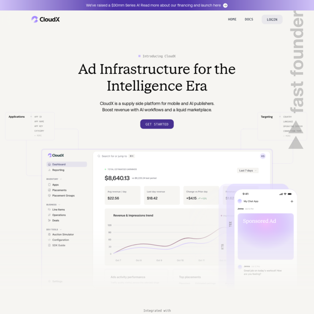 “CloudX is a supply side platform for mobile and AI publishers. Boost revenue with AI workflows and a liquid marketplace.”