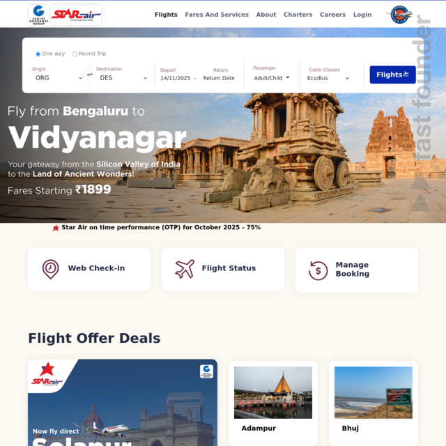 “Fly with Star Air for low-cost domestic flights in India. Enjoy reliable on-time performance, cheap air tickets, easy online booking, PNR & flight status check, boarding & check-in info.”