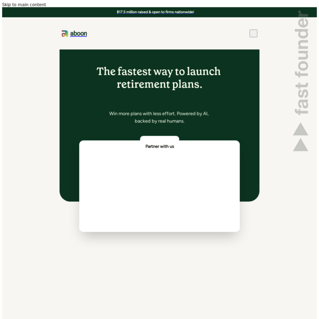 “Aboon helps financial advisors and employers launch and manage 401(k) plans with AI-powered workflows and expert support—simple, streamlined and stress-free.”
