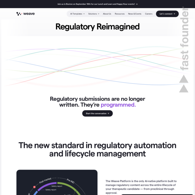 “Weave Bio is an AI-native regulatory automation platform streamlining submissions for novel therapies. Trusted by pharma, biotechs, and CROs, Weave automates drafting, integrates study data, and enhances efficiency—turning regulatory workflows into a strategic advantage.”