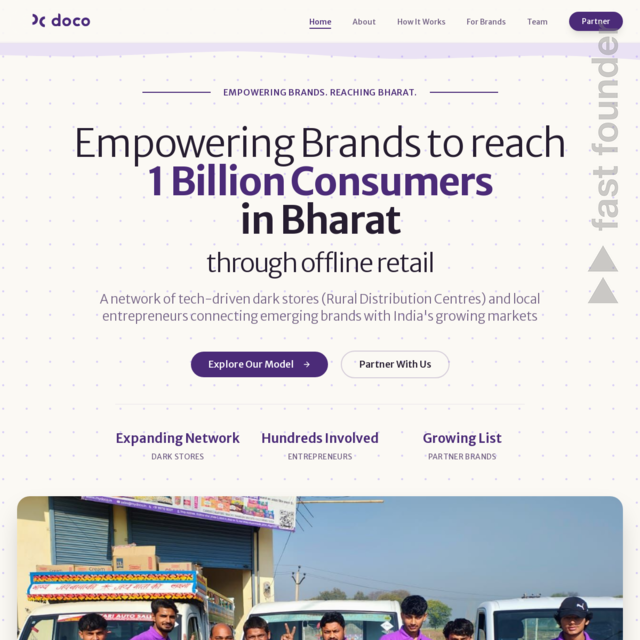 “Smart rural distribution for emerging consumer brands. DOCO enables regional FMCG brands to reach Tier 2, Tier 3, and rural markets through tech-driven dark stores and local entrepreneurs.”