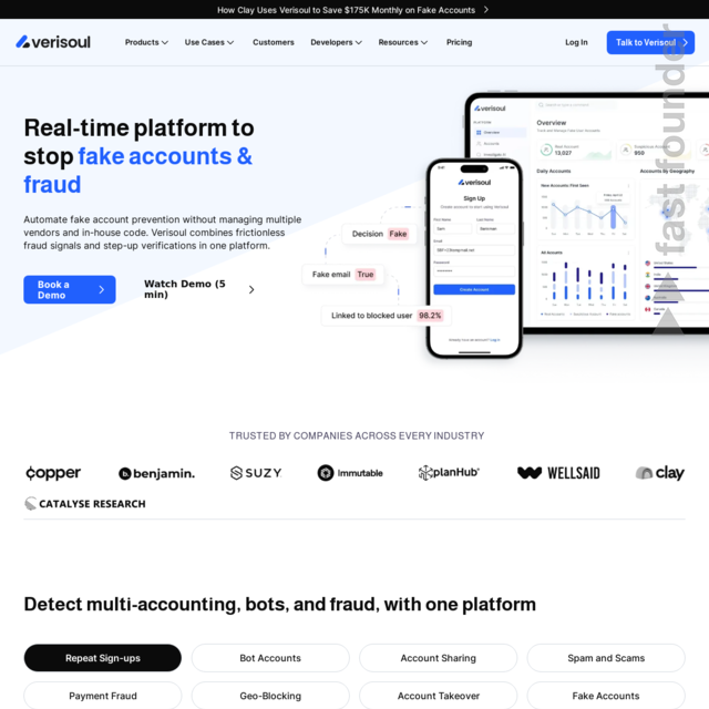 “Fake account detection is easy with Verisoul: automate your manual processes, consolidate vendors, and stay a step ahead so your team can stay focused.”