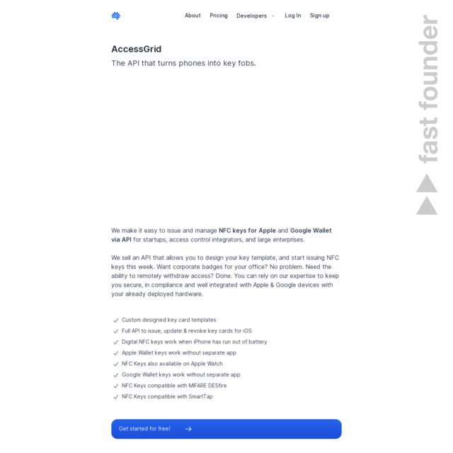 “AccessGrid provides APIs for managing NFC access passes on mobile devices with MIFARE DESFire compatibility. Create and manage secure digital access credentials for your organization.”