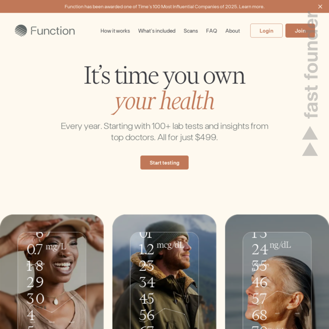 “Discover, track, and own your health with Function Health. With 100+ lab tests and personalized action plan to identify lifestyle changes and promote longevity. Test your levels.”