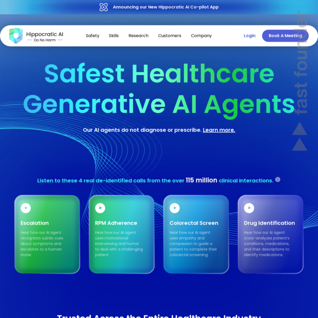 “Safest Healthcare Generative AI Agents Our AI agents do not diagnose or prescribe. Learn more. Listen to these 4 real de-identified calls from the over 115 million clinical interactions. Escalation Hear how our AI agent recognizes subtle cues about symptoms and escalates to a human nurse. RPM Adherence Hear how our AI agent uses motivational”