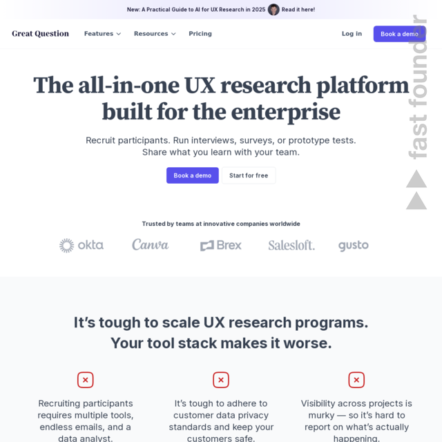 “Recruit participants. Run user interviews, surveys & prototype tests. Store, analyze & share insights. All in one secure, enterprise-grade UX research platform.”