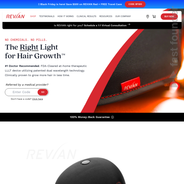 “Try Revian Red risk-free with our 6-Month 100% Money Back Guarantee. Revian's Wireless Cap + Smart App gives you total control of your treatment. FDA cleared for men and women. Clinical trial results establish Revian Red as a safe and more effective alternative to other hair growth treatments.”