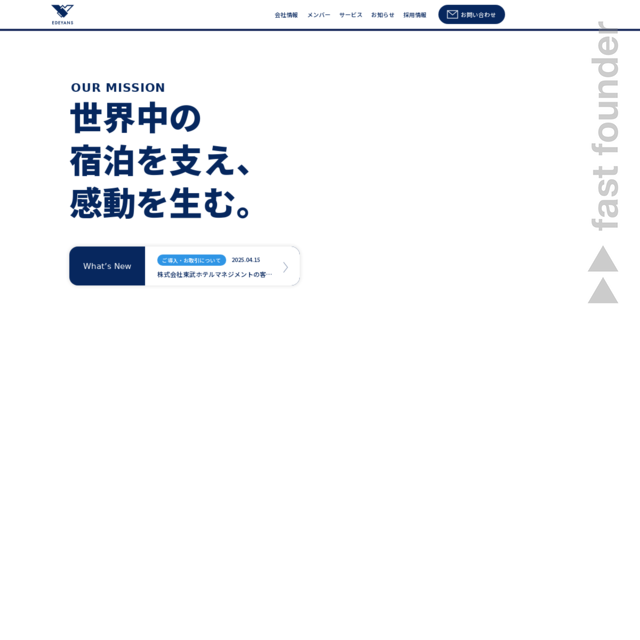 “It is the official website of EDEYANS Co., Ltd. (EDEYANS)."We support accommodation around the world and create excitement.With the mission of "Cleaning rooms in hotels", we are a company that solves the industry issues of hotel room cleaning with our own SaaS development and operation service "Jtas".”