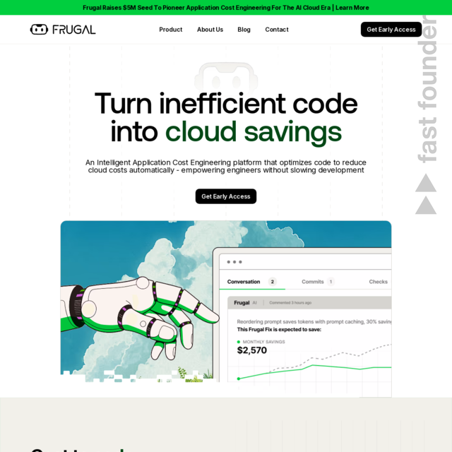 “Frugal is an Application Cost Engineering (ACE) platform that automatically reduces cloud spend by fixing inefficient code patterns in applications. While traditional FinOps tools report on infrastructure spend, Frugal analyzes actual source code to find and fix expensive application behaviors—like excessive metrics reporting to inefficient AI model calls. Frugals AI agents generate pull requests that reduce the consumption of high-cost cloud services without slowing down your developers. After optimizing”