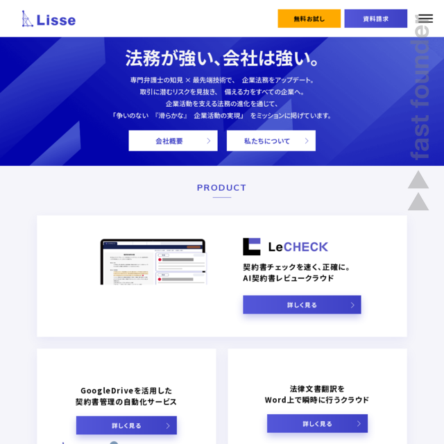 “LISE Co., Ltd. is a legal tech company that develops and provides AI contract review cloud "LeCHECK" and contract translation "LeTRANSLATE" based on the latest AI technology and the knowledge of professional lawyers.We will strengthen Japanese companies by promoting legal DX by support of AI for contract checking and preparation work.”