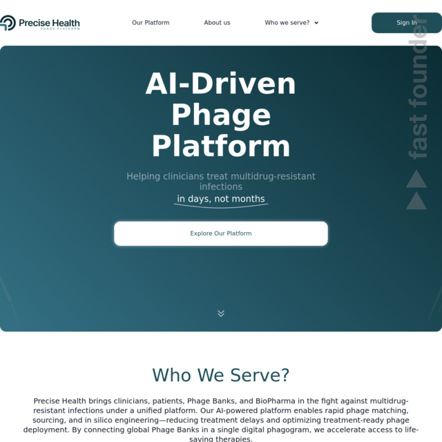“AI-Driven Phage Platform Helping clinicians treat multidrug-resistant infections in days, not months Explore Our Platform AI-Driven Phage Platform Helping clinicians treat multidrug-resistant infections in days, not months Explore Our Platform Who We Serve? Precise Health brings clinicians, patients, Phage Banks, and BioPharma in the fight against multidrug-resistant infections under a unified platform. Our AI-powered platform […]”