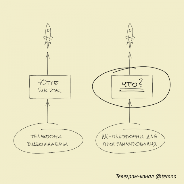 2. Похожая история происходит сейчас с софтом. Уже появились ИИ-платформы, на которых каждый может создать своё приложение, даже не умея программировать. Поэтому до взлёта остался всего один шаг — создать аналог Ютуба или ТикТока для приложений 😱