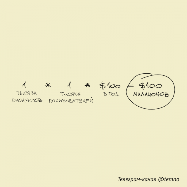 2. Для этого нужно запустить 1 тысячу продуктов, у каждого из которых будет всего по 1 тысяче пользователей. Тогда при месячной подписке в 10 долларов это и принесёт 100 миллионов долларов в год 😱